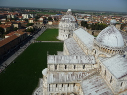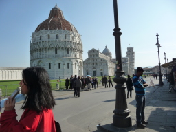 | 大聖堂(ドゥオモ)手前と洗礼堂 ドゥオモはゴシック 洗礼堂は上部はゴシック(とがっている形)で下はゆるいカーブのついたロマネスク様式で建てられている変わった建物です。ドゥオモの中央天井からブロンズのガリレオのランプが下がっていますがガリレオは振り子の実験はやっていないということです。 ここクリック→ |