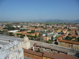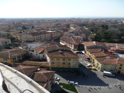 階段をぐるぐる回って鐘が設置してあるところで外に出ます。やった!上に出た と思ってぐるりと一回り すると まだ上に続く細い階段の登り口が目に入ってもう一つ上に そこが一番上 お天気に恵まれて最高ね ピサの街並みです。 |