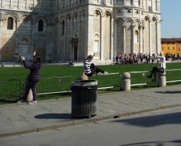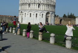 | こうやって倒れ掛かる斜塔を支えよう そういう写真を誰が最初に撮ったんだろう。とにかくみんなそれをやるのね。それで楽しい広場の様子が生まれます。パリのエッフェル塔は手の上に乗せるという写真を撮るんだって知らなかちゃ! | ![]() |
