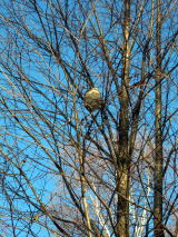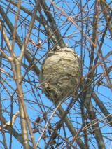 西隣のみずかけ小屋のかつらの木のこずえにできていたクロスズメバチ?の巣 以前ひゅっての軒下にも作っていました。中には何層にも巣ができています。