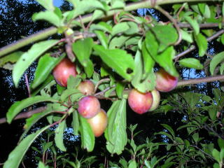 こちらはプラム。花はピンクで実は大型。のはずでしたが、まだ肥料が足りません。でも5年目で実をつけました。地にあるスモモと違って落ちずに赤く熟しました。1日置いておくと甘く熟して美味