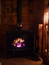最後の頼みはこの薪ストーブ。エンジンがかかれば温風ヒーターは足元にも及びません。華氏3000度 家中のログシェルを暖めます。