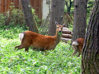 ヒュッテからお出かけ、すぐ先にBMが道を塞いでとまっているものだから、 また何してるんだか と車を止めました。ふと見ると、おいおい道のすぐ脇で鹿の親子が 食事中です。びっくりしましたねえ 連休が終わって人が減ったからでしょうかね。食べる方が優先、どうせ何もされないから 車から手が届きそうな距離です。さすがに車から出たら 離れていきました。よっぽど数が増えているって言うことです。 田んぼはどこもネットで囲われるようになりました。わがヒュッテも、縄を張り巡らして完全防御。