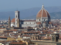 | この高台は市内の展望所になっています。途中は高級住宅地ということが一目で分かるシャトーのようなお屋敷がいくつも目に付きました。どこでも高いところはそういう屋敷が建つ場所になるんですよね。 フィレンツェ市内 はじめて見た時はこの統一されたオレンジの屋根に感動したものです。 | ![]() |